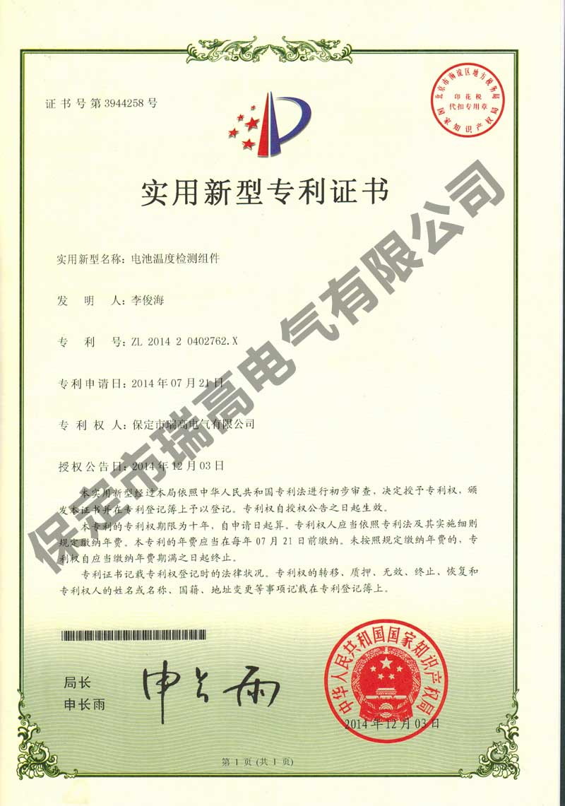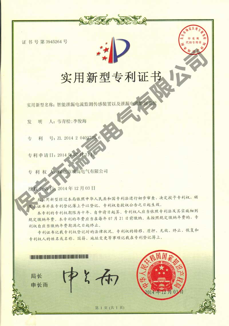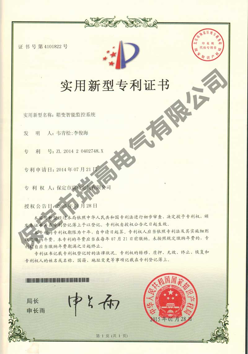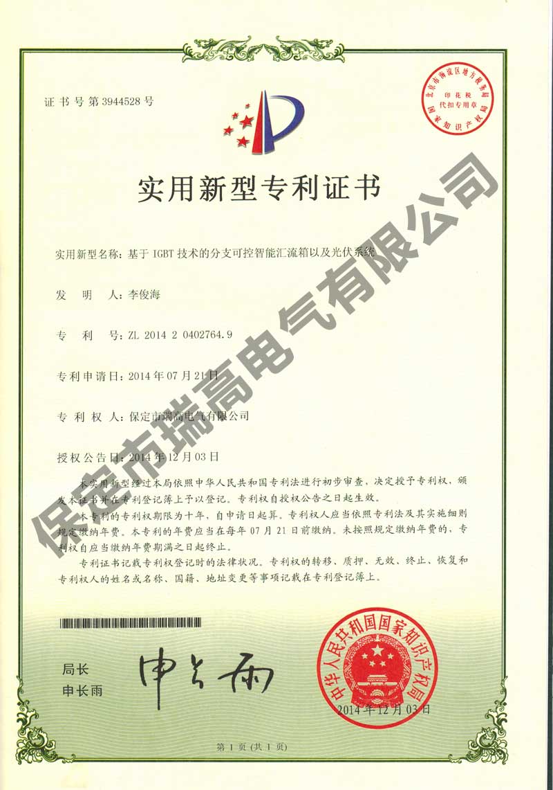 職業健康安全管理體系認證證書職業健康安全管理體系認證證書質量體系認證證書質量體系認證證書電池溫度檢測組件電池溫度檢測組件放電間隙放電間隙基于IGBT技術的分支可控智能匯流箱以及光伏系統基于IGBT技術的分支可控智能匯流箱以及光伏系統新型智能型變壓器風冷控制柜實用新型專利證書新型智能型變壓器風冷控制柜實用新型專利證書箱變智能監控系統箱變智能監控系統智能泄露電流監測傳感裝置以及泄露電流監測系統智能泄露電流監測傳感裝置以及泄露電流監測系統