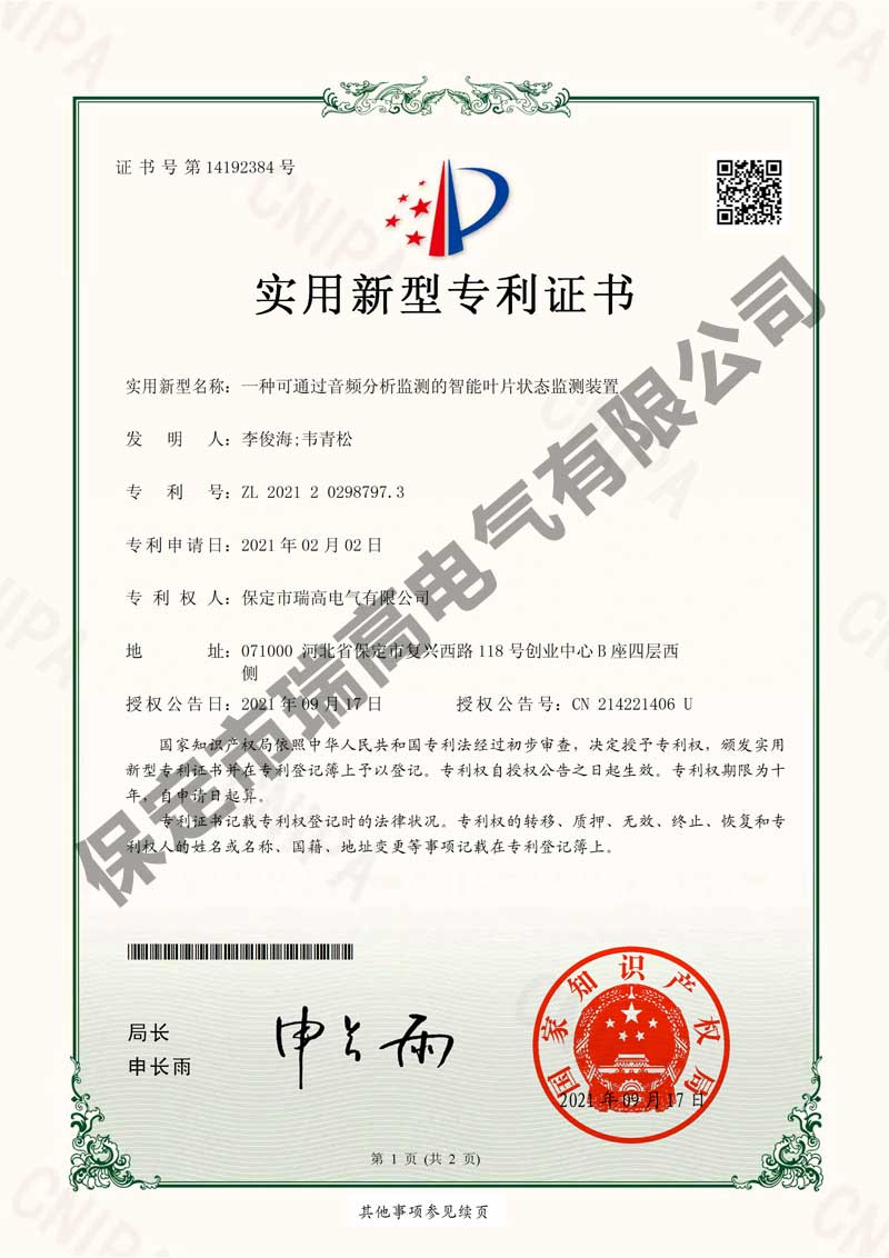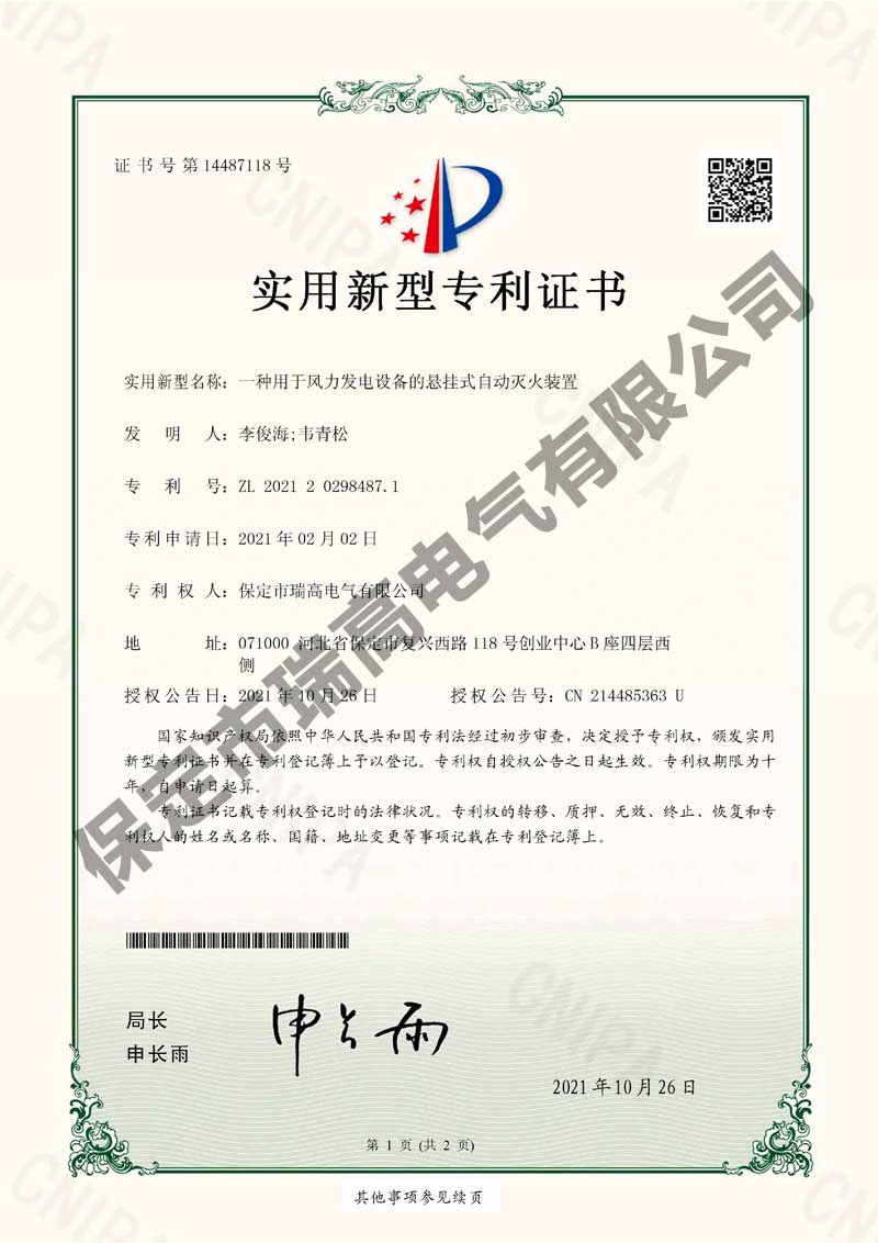 風力發電機振動監測系統及振動抑制方法風力發電機振動監測系統及振動抑制方法電流檢測系統電流檢測系統干粉滅火設備干粉滅火設備葉片狀態監測裝置葉片狀態監測裝置懸掛式自動滅火裝置懸掛式自動滅火裝置接地保護裝置接地保護裝置箱變測控裝置箱變測控裝置環境管理體系認證證書環境管理體系認證證書
